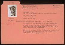| Description: | Fragment of the discus of a large lamp (?). A bear attacks a man. The foreparts of the bear and one leg and an arm of the man, with short sword, are preserved. Red glaze, on the top, a little along one edge of the under side. The bear's eyes pierced. Micaceous orange clay. Type XXVIII of Corinth collection. | |