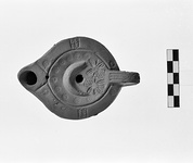 | Description: | Plain rim, with herringbone panels and an impressed circle on either side of handle and nozzle. On discus, in the center, crescent; below, along the outer edge of the discus, ten impressed circles; above, a central filling hole, and two daisy-like flowers, with grooved petals. Handle solid, with a hatched central band. On reverse, small single circular groove. Dark-red wash. Red clay. Type XXVIII of Corinth collection. ADDENDA For nozzle cf. Corinth IV, ii, p. 105, fig. 49, no. 1. | |