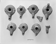 | Description: | Ring foot, rising beneath. No handle. Upper body ribbed, with palmette at base of nozzle. Large double-scroll lugs on each side of body. Black glaze much peeled. Pinkish-buff clay. Type XVIII of Corinth collection, type 45C of Agora collection. | |