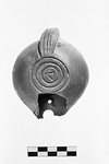 | Description: | Nozzle missing. Wavy lines on rim; discus, band of short herringbone motifs, end-to-end, within which an eight-pointed star, with filling hole and its moulded rim in center. Grooved handle, solid; air hole at base of neck. Bottom has triple concentric grooves, within which a signature "Δ", surmounted by a dot. Purple-red glaze wash. Light red clay. Type XXVIII of Corinth collection. | |