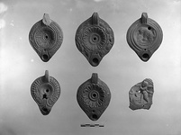 | Description: | Discus only preserved. In relief, winged Eros, left, playing the double flutes before a low altar (?) on which sits a goat. Behind the goat, a stele (?) surmounted by a pine cone. Unglazed. Micaceous pink clay. Type XXVII of Corinth collection. | |