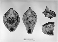 | Description: | On rim, double row of concentric circles; somewhat defaced. On discus, seated lion, facing right; two oil holes. Handle, plain, narrow. Nozzle, plain, with channel to neck. On reverse, single circular groove, with signature above three large impressed circles. Unglazed. Light red to buff clay. Type XXXI of Corinth collection. <graphic> | |