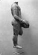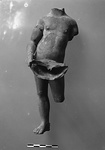 | Description: | Nude standing youth, complete except for head, left arm, and left leg below knee. Projection at inside of right heel broken away. The figure, elaborately modelled, stands on his right foot, with right hip thrown out and left leg bent. The hands and feet are larger and more coarsely modelled than the rest of the body. The right hand rests on the edge of a lamp, which is attached to the figure at the groin. Front part of lamp broken away; discus plain so far as preserved; rim, polygonal (?), grooved at the back. Red wash all over. Light red clay. Type ca. XXIV-XXV of Corinth collection. ADDENDA Cf. T 1452 (X 625). | |