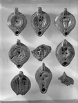 | Description: | Rim, plain with herringbone panels. On discus, boukranion, with filling hole above. Handle, solid, notched central band. On reverse, single circular groove. Purplish-brown glaze. Light red clay. Type XXVIII of Corinth collection. ADDENDA For nozzle cf. Corinth IV, ii, p. 105, fig. 49, no. 1. | |