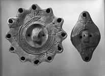 | Description: | On rim, circular band of herringbone pattern between ridges. Nozzles, one at either end of the lamp, with rudimentary volute decoration, enclosing three raised dots on either side of an air hole; half of the top of one nozzle missing. Central handle, rising from a plain discus, with an oil hole on either side; triple grooved; pierced On reverse, double circular grooves. Unglazed. Red clay. Type XXX of Corinth collection. | |