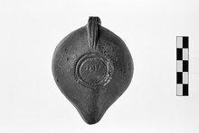 | Description: | Intact. Plain rim, rosette on discus, solid grooved handle. Circular reverse with double concentric grooves enclosing signature: "ONA". Red wash (?) burned quite black. Red clay. Type XXVIII of Corinth collection. | |