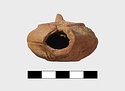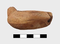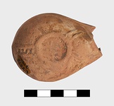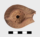 | Description: | End of nozzle broken away. Otherwise intact. On discus, cross. On rim, wavy line and dots. On reverse, low base ring and three pairs of vertical raised lines with dots between. Unglazed. Soft red to buff clay. Type XXXI of Corinth collection. | |