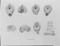 | Description: | Two joining fragments preserve about half the lamp; the front part missing. Handle broken away. Conventional designs on rim and discus, much worn. Underside plain, depressed at the center; no foot. Dull red glaze on exterior and (runny) on interior. Type XXXI of Corinth collection. | |
