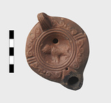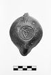 | Description: | Handle semi-pierced. Spirals on panelled rim; on discus, dog sejant, left; underneath, leaf, in relief, inside groove. Poor dull red glaze. Type XXVIII of Corinth collection. | |