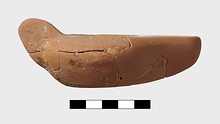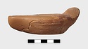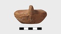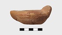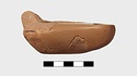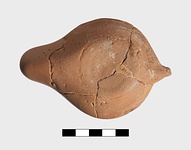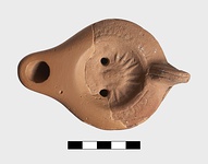 | Description: | Handle and most of rim and discus preserved. On discus, head with rays; rim, out-sloping, with ovules, very faint. Handle, unpierced, two grooves above. Unglazed. Soft orange clay. Type XXVIII of Corinth collection. | |
