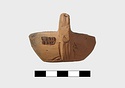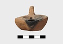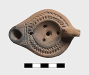 | Description: | Intact. Discus, plain save four filling holes. On rim, herringbone; handle, unpierced; two grooves above and below. Reverse almond-shaped; impressed circles within double groove. Unglazed. Type XXVIII of Corinth collection. | |