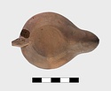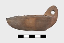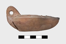 | Description: | Intact. Discus, plain. On rim, pairs of raised dots. Handle, pierced, three grooves above and below; at base short cross strokes. Reverse, plain. Unglazed. Clay reddish to buff (?). Type XXVIII (?) of Corinth collection. | |