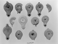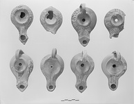 | Description: | Much of lower body, nozzle and handle missing. Fragmentary. Rosettes and rows of dots on shoulder in relief; rosettes also on lower body. Dull black glaze. Type XIX of Corinth collection, type 58B of Agora collection. | |