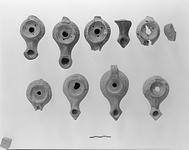 | Description: | Nozzle only. Long nozzle with lozenge-shaped end, decorated with grooves and with three stamped palmettes next to body. Gray clay and glaze. Type XIX (?) of Corinth collection, type 49A of Agora collection. | |
