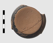 | Description: | Nozzle and handle missing. Broad slightly offset flat base; torus profile; horizontal strap handle. Dull black glaze, worn. Scratched in dry clay of under side. Type IV of Corinth collection, type 21C of Agora collection. <graphic> | |