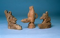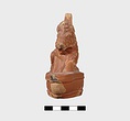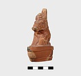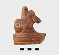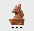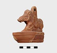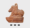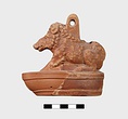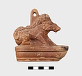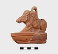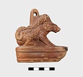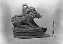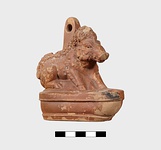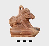 | Description: | Part of infundibulum broken away. A wild boar couchant, rests on a high base. A pierced suspension lug rises from his shoulders; in his back is the filling hole. Pale yellow clay covered with dull red paint. | |