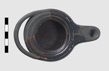 | Description: | About half preserved; handle and end of nozzle missing. Low base; horizontal band handle; nearly vertical walls; rim grooved, insloping. Glossy black glaze. Type V (second variety) of Corinth collection, type 24A of Agora collection. | |