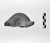 | Description: | A little more than half the lamp preserved in a single piece. Discus, plain. Herringbone on rim; unpierced handle, three grooves above, one below. On reverse, impressed circles and two concentric grooves; at center the signature. Unglazed. Pale buff clay. Type XXVIII of Corinth collection. <graphic> | |