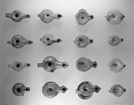 | Description: | Intact. On discus in relief, figure of nude youth facing his right hand on his mouth, his left holding a cornucopia. High headdress. Harpocrates (?). Plain rim with grooves at inner edge, and two small impressed circles at junction with nozzle. Handle double grooved above, plain below. Single groove around reverse. Red glaze over white slip. Type XXV of Corinth collection. | |
