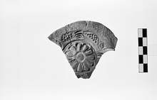 | Description: | From mold for top, discus and about two-thirds of rim preserved. Vine design on rim; rosette on discus. Traces of buff slip inside. Flaky red clay. Type XXVIII (late type) of Corinth collection. | |