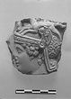 | Description: | Preserved is the head of Athena Parthenos in relief left; broken off at neck, the nose chipped, and most of the crest of the helmet missing. The face is carefully modelled, the iris and pupil of the eye are indicated. In front of the ear a mass of curls escapes from beneath the helmet (cf. the Aspasios gem). The earring is a large oval drop, decorated with small indentations; a single curl can be seen between it and the edge of the neck piece. A band, widening toward the center, borders the helmet across the brows; it is decorated with small rosettes between two narrow ridges. A large rosette (chipped) covers the junction of this band with the border of the neck piece, which consists of two narrow ridges. At the upper left of the fragment is a trace apparently of the shoulder and the wing-feathers of the sphinx; behind is the winged horse, complete save for top of head, and wings. The space between the body of the horse and the rosette below is filled by the small upturned cheek-piece (upper part chipped) on which is represented a small nude figure carrying something in his bent left arm (?). Branching spirals cover the back of the helmet. Along the right edge of the fragment the start of the crest is preserved. Perhaps from the discus of a very large lamp. Dark pinkish-buff clay with lighter surfacing. Type XXVII of Corinth collection. | |