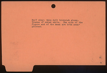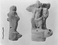 | Description: | End of nozzle slightly broken; otherwise intact. A standing figure with outspread wings and high top-knot, drapery across his legs, the right hand resting on a low pillar, the left hand holding a mask. At the back an unpierced handle with three grooves like that of a type XXVIII lamp. Oval base, grooved. Thin dull brownish glaze. Traces of added white. The eyes of the figure and of the mask are both semi-pierced. Buff clay. | |