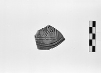 | Description: | Fragment of bottom preserved. On bottom, double almond-shaped groove, enclosing a double rectangular groove, within which is the lower part of a signature. Grooves and letters rather deeply and carefully made. Purplish-red wash. Pinkish clay. Type XXVIII of Corinth collection. <graphic> | |