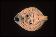 | Description: | Intact. On the discus, Christian monogram. Rim, impressed circles; reverse, three concentric grooves. Unglazed Reddish-brown clay. Type XXVIII of Corinth collection. | |