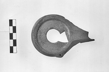 | Description: | Most of upper half preserved. Wide sunken top; nozzle flat on top, pierced lug on side. Dull black glaze, worn. Overfired gray clay. Type XII of Corinth collection, type 43B of Agora collection. | |