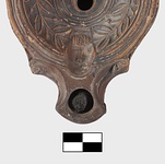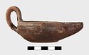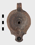 Discus, large and concave, decorated with ivy branches and, at the nozzle, a small jug. Rim, grooves. Nozzle with volutes. Handle plain, high swung.