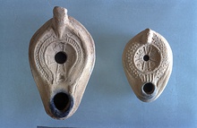 | Description: | Intact. Jewelled cross on discus; herringbone on rim. High knob handle. Raised ring on underside, with rib to base of handle. No glaze. Light reddish-brown clay, buff at surface. Type XXXI of Corinth collection. | |