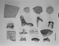 | Description: | Two non-joining parts including rim and one handle attachment. Shallow body flattened on top. Plain rim; horizontal handle. Walls show deep curve. Traces of flaky black and red glaze inside and outside. Handmade (?). Pinkish-buff clay, traces of burning on rim. Type 9 of Agora collection. ADDENDA Clay close to Smyrna (?). Cf. L 3376. | |