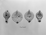 | Description: | Intact. Discus, decorated with reveller (?) to right carrying cup torch and cloak. Rim, plain with panels. Handle, pierced, two grooves above and below. Reverse, within single groove signature "ΤΡΗΤΙΟΥ". Type 27 of Agora collection. Early second century. | |