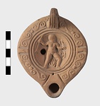 Disc, decorated with Poseidon with dolphins and trident; two framing rings.