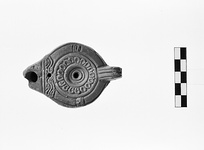 | Description: | Intact except for large chip from nozzle. Filling hole set low, three moulded rings, circle of ovules, moulded ring; flat narrow rim with two vertically grooved sections; groove. Unpierced, grooved handle, nozzle set off by transverse ridge with wavy line and air hole. Flat base, within two circles, branch. Orange glaze. Light orange clay. | |