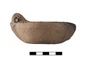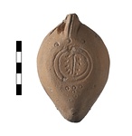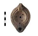 Disk: six branches within plain framing ring. Rim: herringbone. Handle: unsuccessfully pierced with extracted clay still in place, groove on handle extend into volute-like grooves into disk.