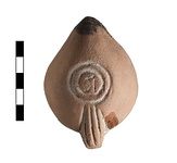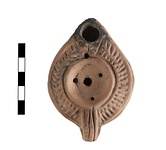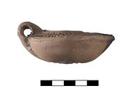 | Description: | Complete. Burnt at nozzle. Plain disk with three small holes around central air-hole and extra one close to nozzle. Herringbone rim. Nozzle flanked by groove. Pierced, grooved handle. Rounded base with letter K within a double circular groove. Dark pink fabric. 2nd half of 4th c. A.D. For similar signature see Agora VII, 1374 (L 2526) and p. 41. | |