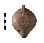 | Description: | Nearly complete. Mended from seven fragments. Missing fragment near handle and under nozzle. Burnt at nozzle. Disk: ring, rays framed by dots; framing ring. Rim: plain with two incised panels. Nozzle defined by groove. Solid grooved handle. Base: within one ring: ΣΤΡ / Α. Στρατόλαος workshop. Reddish-orange fabric; thin, reddish-brown glaze. 4th c. A.D. Cf. Agora VII, 1606 (L 1297) and pp. 50-51. Fragments mended with BH 458. | |