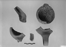 | Description: | Fragment of a handmade lamp, with open nozzle. Most of the nozzle and part of the body preserved. Sides make sharp angle. Nozzle much blackened. No glaze. Surface worn. Coarse micaceous clay, red to grayish. Type 2B of Agora collection. | |