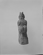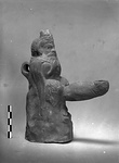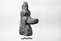 | Description: | Ithyphallic figure of Pan playing pipes. Mended from three pieces; complete save for chips. Mold made. Pan is seated cross-legged on a rock; he has horns, goat's legs, and pointed ears, and wears a cloak over his back and shoulders. A large phallus, which is the lamp proper, with nozzle, filling hole and oil reservoir, extends outward from below his knees. Behind his shoulders is a small pierced vertical handle with double groove, as in lamps of type XXVII-XXVIII of Corinth collection; the wick hole, surrounded by a raised band, recalls the nozzles of Type XXVII. Smal, pierced holes for the pupils. Purplish wash, in part worn off. Hollow; open beneath. Pinkish-buff clay. | |
