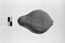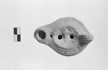 | Description: | Rim, down sloping, with row of impressed circles. On discus, a horse (?) galloping left. Handle solid, double grooved above. On the reverse, palm branch, within almond-shaped groove, much worn. Slip (?). Light red to buff clay. Type XXVIII of Corinth collection. | |