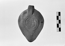 | Description: | Nick in one side. Like L 956, except that the rosette has more rounded petals. On rim, herringbone. On the reverse, a palm branch. Dark buff slip. Dark red clay. Type XXVIII of Corinth collection. | |