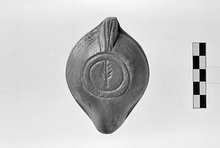 | Description: | Convex sides. On rim, wavy lines. Plain discus, with grooves around edge. Cross bar at base of nozzle. Solid handle, with triple groove above and below. On reverse, within double circle, a palm branch. Buff slip. Reddish clay. Type XXVIII of Corinth collection. | |