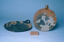 | Description: | Chipped; handle missing. A rectangular object. Handle attachment on back, and rows of projections on face. Red coarse clay. For grating, or for carding wool (?) | |