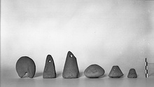 | Description: | Intact but chipped. Conical walls, concave base. Pierced through center. On side, glazed hooks between bands. Underneath, two glazed circles, and a circle of dots. Black glaze. Buff clay. | |