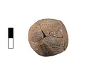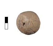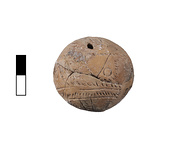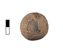 | Description: | About two thirds preserved, with one of suspension holes. Restored in plaster. Hollow ball. Incised ware. Top and bottom, a circle described by confined strokes; within them, radii. Around belly, a stroke serpentine, with impressed circles in the waves. Soft, pinkish buff clay; surface polish entirely lost. Early Geometric. | |