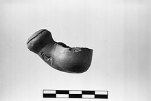 | Description: | Rim broken away. Round pipe with keel, sacklike bowl, and very short, fat stem-socket. Rouletting along keel where it joins bowl. Stamp on lower right side of stem socket, in shape of bird. Reddish-brown clay and slip, burnished. | |