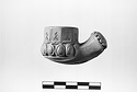 | Description: | Stem socket missing; about one third missing. It has keel bottom, round bowl, straight-faced rim and faceted stem-socket. Around the bowl a row of moulded and incised raised ovals; on each fact of rim, palmette and leaf stamps combined into one decorative motif. Reddish-brown clay, tan slip, highly burnished. | |