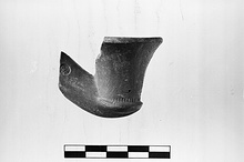 | Description: | Part of rim and stem end of stem socket broken away. It has a bowl reduced to a small button disk, high flaring cup-like rim, keel bottom and flaring stem socket. A row of rouletting decoration at base of rim, and an impressed floral (?) pattern up the front of the rim. On stem socket, right, a seal. Orange clay, red slip. | |
