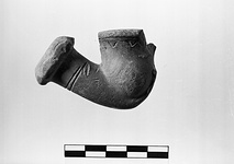 | Description: | It is of lily type, bowl and rim blended together, heavy keel continuing beneath bowl and up the front, where it becomes a decorative element. Long stem socket with heavy moulded ring at stem end. Impressed decoration below lip and on front. Orange clay, red slip. Cf. MC 1296. | |